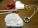 絵画展の来場記念に12色の色鉛筆をもらい、くじを引いて遠鉄バスの「チョロQ」をもらいました。