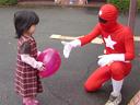 左の画像は、赤いヒーローです。怖がるかと思ったら意外と好きだったようです。握手をしてもらいました。