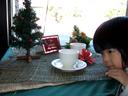 左の画像は店頭のクリスマス飾りを覗き込む様子です。