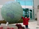 そのあと、地域情報センターの前にある地球儀のオブジェを見たいと言うので寄ってみました。大きな地球儀が地軸で傾いているのでちょうど瑠衣が手で支えているように見えます。