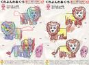 左の画像は図鑑を見ながら塗り絵をする様子です。右の画像は「虹色のライオン」と「観察して描いたライオン」です。