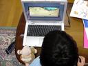 瑠衣は「おはなし絵本クラブ」の「日本の昔話」の「したきりすずめ」を読んでいました。なぜかお気に入りのぬいぐるみも一緒にパソコンの前に置いています。