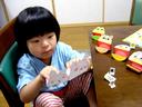 7月号の年中コースは「ぱくぱく ぱっくん」というハサミを使って工作をするものでした。自分でウサギの絵を描いてオリジナルのぱっくんも作りました。ハサミで絵に沿って切るのは四苦八苦していました。完成した「ぱくぱくぱっくん」を並べて「みんなで演奏会しているの」と言ってご機嫌でした(左画像)