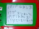 パパが足裏の角質を触っているうちに真皮までめくってしまい、血を出してしまいました。瑠衣はパパの足の治療している様子を見て、落書き板の「スーパーせんせい」に何か書き出しました。