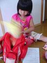 25日の朝、瑠衣は前夜に枕元に用意しておいたストッキングを覗き込むと「なんだ?」と手紙を取り出しました。そこにはサンタクロースからの手紙があり「Dear RUI Hi! Your socks were too small to put your present. I put a present on your shoes.From Santa Claus(瑠衣ちゃんへ 靴下が小さすぎたのでプレゼントを入れることができませんでした。靴の上に置いたよ。サンタより)」と書いてありました。瑠衣は英語を読むと慌てて玄関に行き「500ピースのディズニーキャラクターのパズル」を発見し大喜びしていました。(いやはやサンタの演出をするのは大変でした)下の画像がプレゼントとサンタクロースからの手紙です。