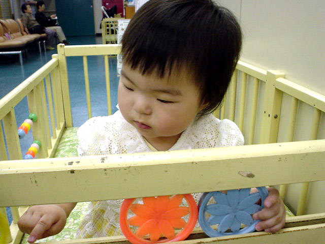 ベビーベッドで遊び始めました。この日の予約の7人は生後一ヶ月の