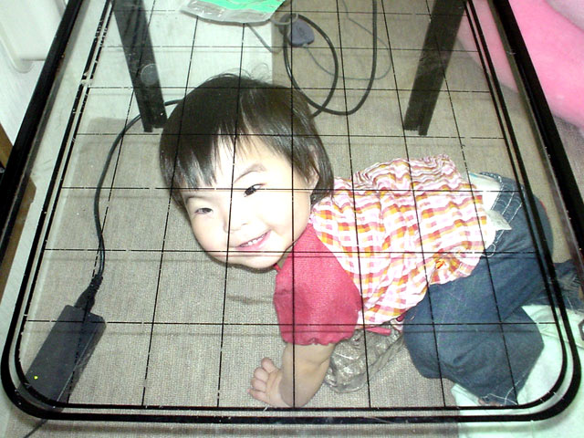 左の画像は6畳の洋室あるガラスのテーブルの下に潜り込んで居る様子です。
