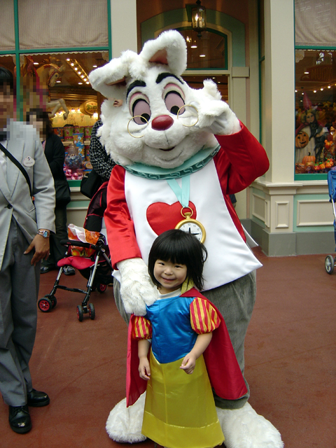 入園して1分もしないうちに、「不思議の国のアリス」のホワイト・ラビットと遭遇しました。 今まで、数回ディズニーランドに来園したことがありますが、着ぐるみキャラクターとこんなに簡単に遭遇したことなんてなかったので、とても感動しました。 ただし、ホワイト・ラビットを瑠衣は覚えていないようです。一度「不思議にの国のアリス」の映画を見たことがあったのですが・・・。 |