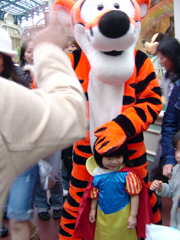 なんということでしょう、今度は「くまのプーさん」の「ティガー」発見!! 大好きなプーさんの友達キャラクターです。 瑠衣は、「ティガーだ〜」と擦り寄っていき足を触ってばかりいてなかなかシャッターチャンスがなかったのですが、ティガーがそっと頭を撫で正面に引き寄せてくれて撮影が出来ました。 ありがとうティガー。 |