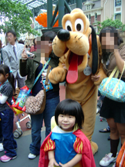 ティガーを撮影して後ろを見るを、なんとそこにはミッキーマウスの愛犬「プルート」がいました。 瑠衣は他人様(2人の女性)が記念撮影しているのに便乗して一緒に撮影してもらいました。 瑠衣は、撮影よりも実際に触りたいようで、人にもまれながら「プルート〜」と言いながら足を触りに行っていました。プルートは大人気でした。 |
