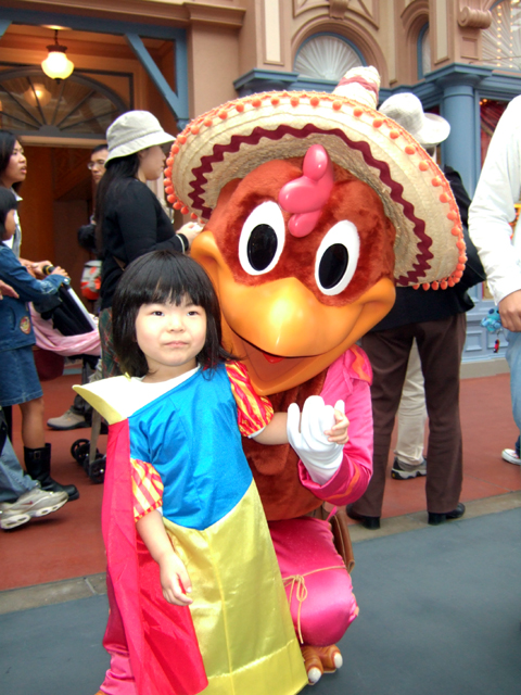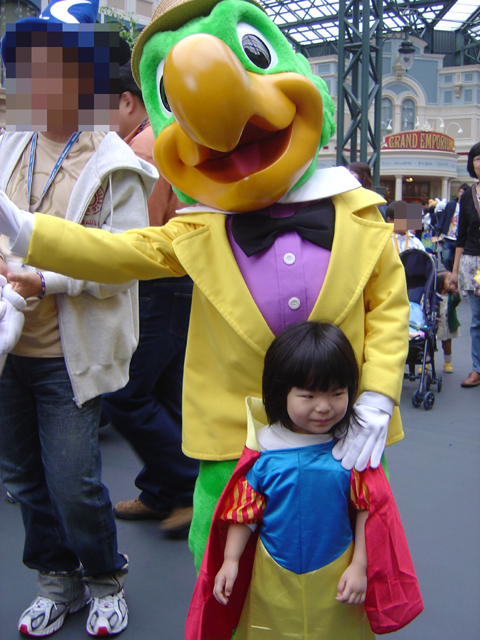 そして、プルートを撮影後すぐに、この分からないキャラクターも遭遇しました。帰宅後この緑のオウムの正体が分かりました。ドナルドダックの長編アニメ『ラテン・アメリカの旅』(1943年)と『三人の騎士』(1945年)にでてくるオウムの「ホセ・キャリオカ」というキャラクターだそうです。ぜひ一度この映画を見なくては。 瑠衣も「だれこれ?」って感じです。 |