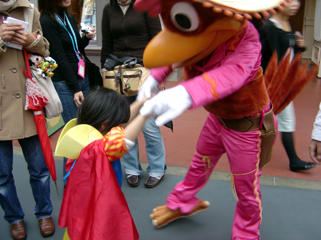 緑のオウムを撮影したらすぐ横に、赤い鳥がいました。このキャラクターは、なぜか瑠衣に興味を示してくれ、手をつないでくれました。 帰宅後、この鳥もドナルドダックの長編アニメ『ラテン・アメリカの旅』(1943年)と『三人の騎士』(1945年)にでてくる赤いオンドリの「パンチート」だということが分かりました。 |