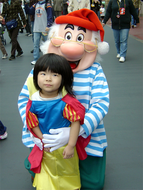 このキャラクターも、撮影したときは全く勘違いしていました。てっきり「白雪姫」に出てくる「7人の小人のひとり」だと思い込んでいました。白雪姫の仮装をしてきたので、ベストショットだと喜んでいたのですが、帰宅後よく見ると小人ではないことに気が付きました。 これは「ピーターパン」のなかにでてくる海賊船の水夫長の「スミー」でした。ピーターパンの映画の中でも世話好きキャラですが、瑠衣にも襟元を直してくれました。 (でも小人だと思っていたので、「スミー」と分かったときはショックでした。) |