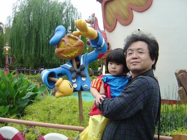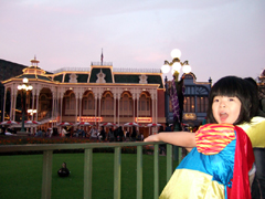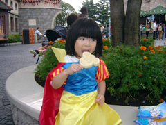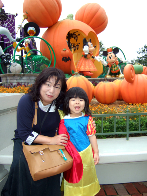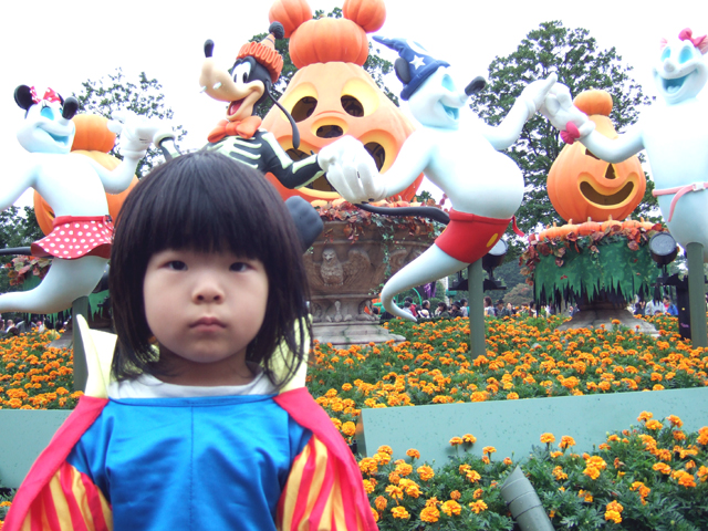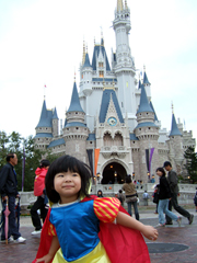 | 2005年10月21〜23日までパパとママが幕張に2泊3日の出張でした。瑠衣も一緒に出張についてきてパパとママが仕事中は保育所で一時預かりをしてもらいました。瑠衣はディズニーランドへ行きたがっていたので、幕張の出張帰りに舞浜の「東京ディズニーランド」へ寄ることにしました。ちょうど、ハロウィーン期間でゲスト(来園者)も仮装が出来るので、瑠衣は「白雪姫」の仮装をしました。 土曜日で混雑し、天候も小雨混じりの肌寒い感じでしたが、短時間の滞在で楽しんできました。(もうすこし人が少なければ更によかったのですが) |