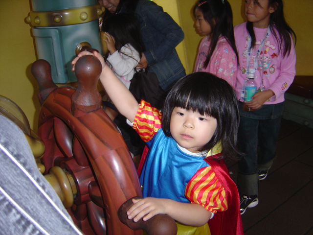 トゥーンタウンの「ドナルドのボート」内で撮影。 このアトラクションは、待ち時間無しで楽しめました。 本当はミッキーの家にいきたかったのですが、80分待ちであきらめました。 瑠衣はドナルドダックの短編アニメで見たのとおなじ船内や舵をみて喜んでいました。 |