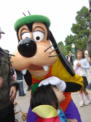 トゥーンタウンでトイレ待ちをしていると、パレードに行く途中の「グーフィー」を発見しました。急遽、トイレをやめて、近くに寄っていきました。瑠衣は相変わらす、触ったりほお擦りをしていました。 急いでいるのか「グーフィー」は頭を撫でながら、どこかへ行ってしまいました。 そのあと、またトイレの最後尾にならびました。 なんでトイレにまで待ち時間があるのかと、ママはすこし嫌になりました。 |