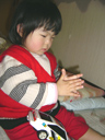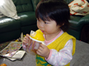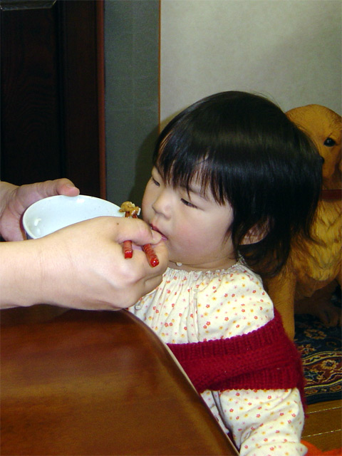 瑠衣は食事の時にスプーンを使っているのですが、このごろお箸で口に入れてもらう ことが気に入っているようです。 この日もパパから納豆ご飯を口に入れてもらっていました。 瑠衣の食事は済んでいるのにパパが食べていると欲しそうに寄ってきます。