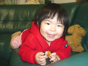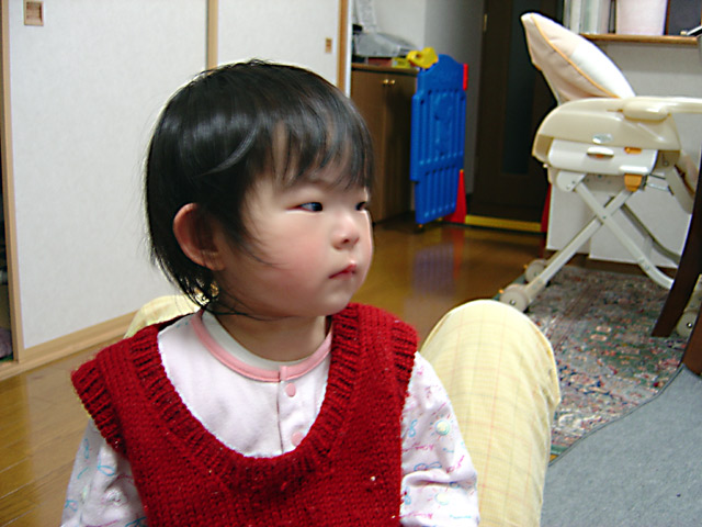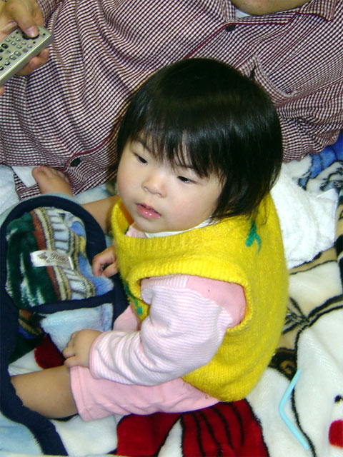 このごろ、パパやママの上によじ登ったり、お腹の上に座ることが多くなりました。 10キログラム以上の重さがあるのでドンドンと跳ねたりするとかなり体に負担になり ます。今日もママのお腹の上に座ってテレビを見ながらリズムに合わせて体を揺らす のでママは「ぐへっ」っと声を出してしまいました。 左の画像はママのお腹の上で座っている様子です。