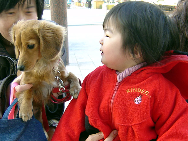 夕方、近くの郵便局まで散歩に行きました。 途中でママの知り合いがミニチュアダックスッフントを連れて散歩していました。 瑠衣は「わんわんわん」と大喜び!犬のほうは瑠衣の勢いに少し驚いていました。 本物の犬を間近に見てしかも触ってとても嬉しそうでした。 おとなしい犬だったから良かったけど、かむ犬もいて怖いということを分からせないと いけないなぁ・・・。 おもちゃの犬と同じように抱きついていったら大変だ!