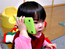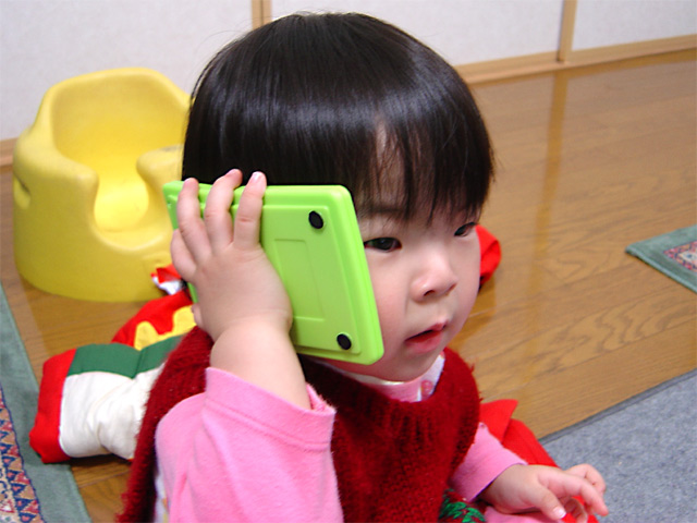 あれあれ、それは電卓ですよ! 瑠衣は電卓(緑色)を電話だと思っているようです。 「はぃはぃっ」とおしゃべりしています。 たしかにプッシュフォンに似ていないことも無いのですが・・・。