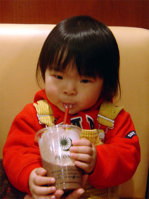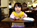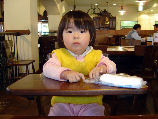 今日はパパは自宅研修日なので久しぶりにランチを隣のレストランで摂りました。 瑠衣はこの店ではウェイトレスさんやウェイターさんに顔を覚えられていて、人気者です。 入り口では受付の店員さんに丁重に挨拶をし、ウェーターさんにはお辞儀をし、ウェイトレス さんには手を振り、瑠衣は大忙しでした。 ランチも瑠衣の口にあったらしく、ママのおすそ分けの「海老のチリソースとパンとスープ」 を美味しそうにパクパク食べていました。最後にはアイスティーもコップ半分くらい飲んで しまいました。