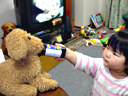 ママが栄養ドリンクを飲んでいると、瑠衣はお気に入りの犬のぬいぐるみを持ってきて 飲み終わったドリンクの瓶を犬に飲ませていました。 「おやおや、ワンちゃんに飲ませるの?」