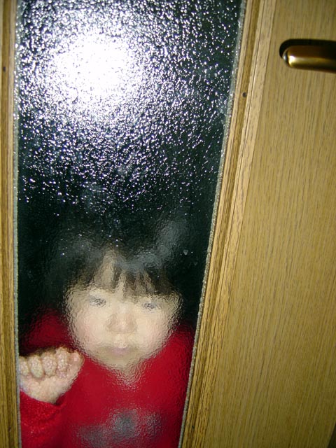 瑠衣はこのごろ、ドアのノブを回せるようになりました。今日も寝室で昼寝をさせていたら いつの間にかリビングのドアの所の擦りガラスに顔をつけて立っていました。 心霊写真のように写っていますね!(パパもママもびっくりしました) 寝室のドアは軽いので開けられるのですがリビングのドアは重くてまだ開けることが出来ない のです。 面白いので撮影しました。