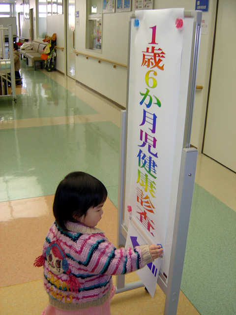 浜松中央福祉センター(隣のマンションの2階)で1歳6ヶ月健診が行われました。 近いので瑠衣は歩いて行きました。 小児科健診、歯科検診、歯へのフッ素塗布、身体測定、面接を問題なくクリアしました。 ただし、同じ年頃の子どもがたくさんいたので興奮して、会場内を走り回ってしまいました。 走り回っていると、瑠衣の肩を軽くトントンとたたく男の子がいました。なんと先週、遠州病院で 一緒に予防接種をうけた男の子でした。お互い、覚えていた様子で「ウヒャーキャーッ」と 奇声を発し合って喜んでいました。1週間くらい前のことも覚えているの様です。ずいぶん記憶時間も 長くなったものです。一緒に窓辺に行き「ブブーッ」と自動車を指して笑い合っていました。 どうやらウマがあうようです。二人とも元気者だし・・・。他の子は親からあまり離れないのに 二人は勝手に遊んでいました。