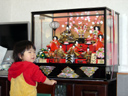伊平のおじいちゃんとおばあちゃんが預けていた雛人形を持ってきてくださいました。 瑠衣はお土産に頂いた、「ミッフィーの指人形」や「絵本」で大喜びで遊んでいます。 左の画像は雛人形を椅子によじ登って見ている様子です。