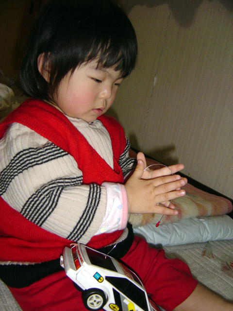 風邪はずいぶん良くなってきました。 痰が上手く出せないので困っているようですが、時々鼻から痰状のものが出てきてスッと しているようです。気道と鼻はつながっているのですがすごい芸当です。 左の画像はママの弟(瑠衣にとっては叔父さん)が子供のころ遊んでいたリモコンカーを 触っている様子です。自動車のおもちゃが好きなようで他にもミニカーなどで遊んでいます。
