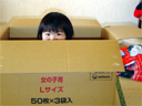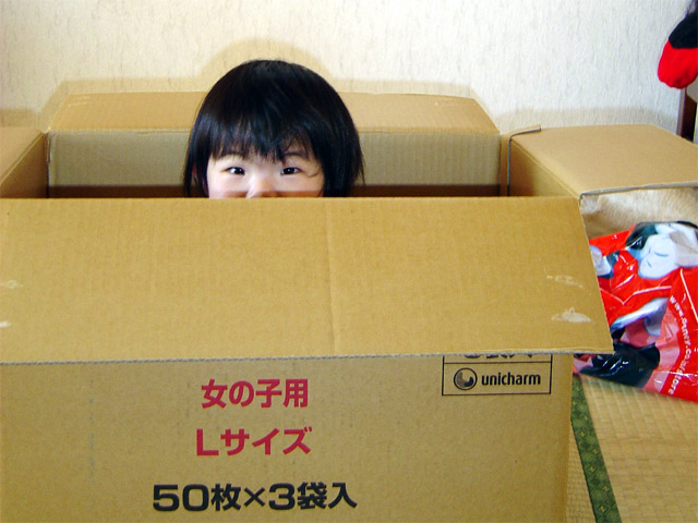 オムツを梱包していたダンボールの中でかくれんぼしています。 本人はうまく隠れたつもりらしいです。 見えているのにね・・・。