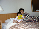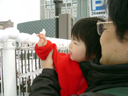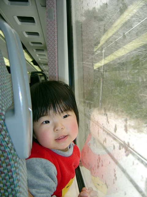 長野に2泊3日の旅行に行きました。(パパとママの用事があったので) 浜松から名古屋までは新幹線、名古屋から長野までは「特急しなの号」に乗車しました。 瑠衣とパパは初めての「特急しなの号」乗車でした。瑠衣は新幹線の中ではおとなしく寝て くれたのですが、「しなの号」では歩き回ってパパとママを手こずらせてくれました。 左の画像は車窓から見える雪景色を見ている様子です。豪雪地域を列車はゆっくり長野まで 走りました。