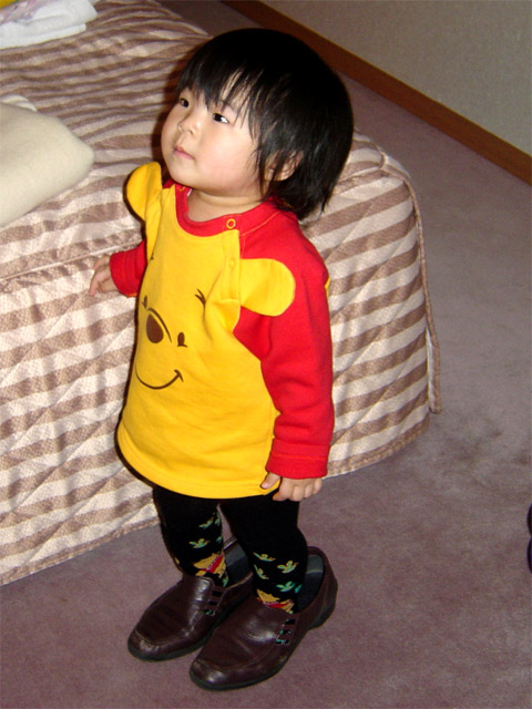 この日は一日中、瑠衣は託児所に預かってもらいました。 当初は託児所に預けることに躊躇したのですが、全国チェーン展開している託児所で 駅近くの割と環境の良い立地だったのでお任せしました。 保育士さんやスタッフの雰囲気もよく、瑠衣は預けた瞬間から楽しそうに遊んでいました。 ママが「バイバイ」と声をかけても後ろ向きに「ばいばーい」と面倒くさそうに答えて、 すでにいた3歳くらいの男の子と楽しそうに遊んでいて少し肩透かしをくらってしまった 感じでした。 でも夕方迎えにいったときは嬉しそうに近寄ってきたので待ってくれていたのでしょうね。 保育士さんのお話によるととても楽しく1日過ごしたとのことです。 左の画像はホテルに戻ってきてママの靴を履いているようすです。