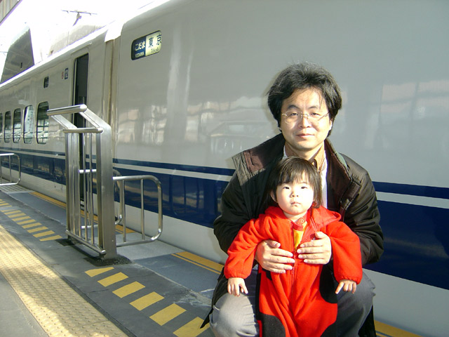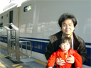 新幹線に乗って福山のママの実家まで遊びに行きました。 左の画像は浜松駅で新幹線を背景に撮影しました。 名古屋まではおとなしく乗っていたのですが、岡山あたりからくずって困りました。 風邪を引いてしまったようです。