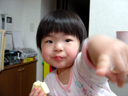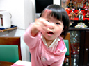 このごろ、はっきりと自己主張をしてくるようになりました。 ただし、まだ言葉で表現できないので、ママやパパに思うように伝わらなくて 瑠衣はイライラしてしまい、泣いたり、両手でテーブルやママやパパに八つ当たり してきてしまいます。(困った困った) この日はチーズが食べたかったらしいのですが、なかなか何を欲しているのか分から なくて困ってしまいました。 すこし泣き顔でチーズを食べています。