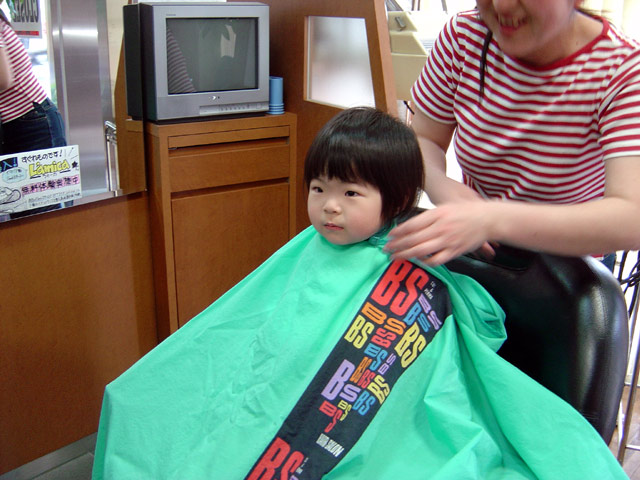 パパが散髪に行くというので瑠衣もついでに髪を切ってもらいに理髪店に行きました。 産まれてから前髪はママがカットしていたのですが、後や側面の髪はカットしたことが なかったのでボサボサになってきてしまいました。 ということで軽く揃えて、きちんと前髪をカットしてもらいました。 カットの間、瑠衣は理髪店の色々な備品を指差しては「わぁー」「あっ」「きれー」 と感嘆しきりでした。髪をカットすること自体は嫌ではないようで鏡をみてニコニコ していました。出来上がりは、前髪は軽くなって全体もまとまってかわいくなりました。 左の画像は髪をカットする前の状態です。上下する椅子が気に入ったようです。