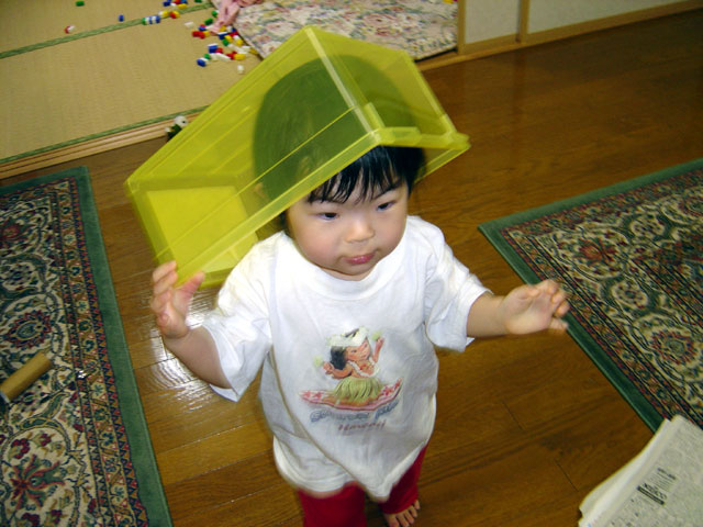 瑠衣は、ブロック遊びが大好き!!ザザーッとブロックを箱から出して頭に 被っています。 親たちの「うけ」を狙っています。このごろは親を笑わそうとしているのか 色々面白いことをワザとしています。