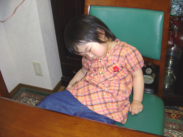 赤ちゃん用の椅子は窮屈になってきました。 食事の時も、大人用の食卓椅子を使用しています。 ただし、時々眠くなってしまうので、まだまだ危険です。 左の画像は、いつの間にか、椅子の上でうたた寝している様子です。 落ちそうで落ちないようにバランスを絶妙に取っていました。