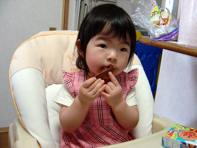 近くのスーパーで「アンパンマン」の顔の形のチョコレートックッキーを買いました。 瑠衣は、チョコレート部分ばかりぺろぺろとなめるので、顔中チョコだらけです。 あらら〜