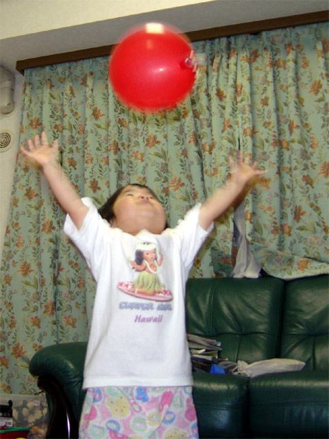電気屋さんで、風船をもらいました。 自分で上に放り投げてキャッチしたり、ママやパパがゆっくり投げてあげても自分で キャッチできるようになりました。 室内で30分くらい、ママと風船の投げあいをして二人とも疲れてしまいました。
