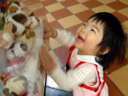瑠衣とママは散歩に出かけました。本当は寄るつもりは全くなかったのですが、 マクドナルドの前で瑠衣が左の画像の状態になってしまいました。 子供用のセットにおまけでついてくる「犬のぬいぐるみ」の展示を見て、おおはしゃぎ! 結局、マクドナルドで昼食を購入しました。