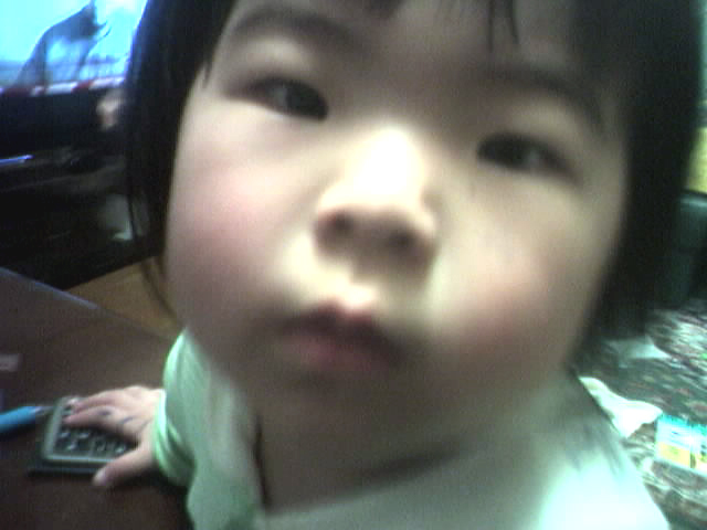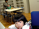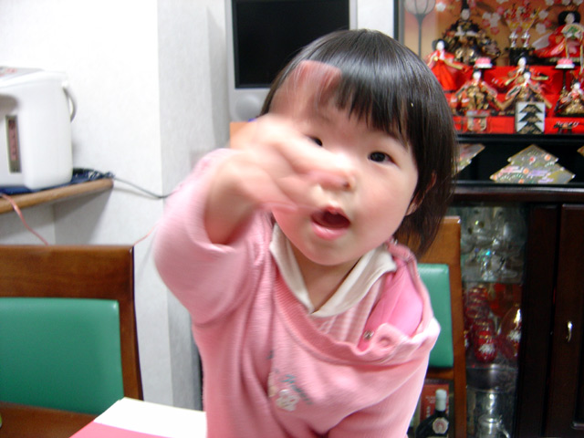 ママの仕事用の小さな(68mm×13mm×16.5mm)のデジタルカメラで撮影しました。 とても小さなカメラでシャッター音もしません。瑠衣もなんだろうという顔で 覗き込んできました。 瑠衣はこのごろカメラを向けるとポーズをとるようになってきたので、自然な 顔を撮影する時はこの小さなカメラが役立ちそうです。(画質が悪いですが)
