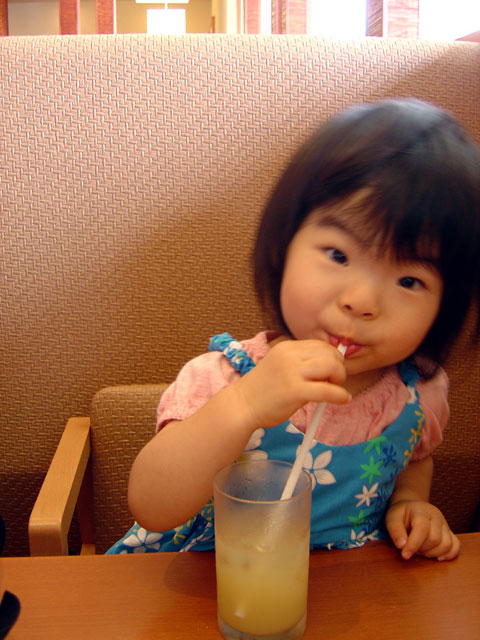自宅の近所に和食のファミリーレストランが新規に開店しました。 お値段も手ごろでランチが580円です。 早速パパとママと瑠衣の3人で食事に行きました。 お子様メニューのジュースは100円で飲み放題でした。 瑠衣は2杯もりんごジュースを飲んでしまいました。