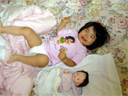 夕食後、瑠衣の姿が見えないと思ったら 「ねんねしよーねぇー」とか「よしよし」という瑠衣の声が寝室から聞こえてきました。 あらあら、眠いのかな?とおもってこっそり覗くと、人形の「ぽぽちゃん」を相手に瑠衣が お話していました。しかもタオルを人形の「ぽぽちゃん」にかけて布団のつもりのようです。 ママに見つかると瑠衣は少し照れたようにしていました。 人形遊びも出来るようになったのねぇ・・・。