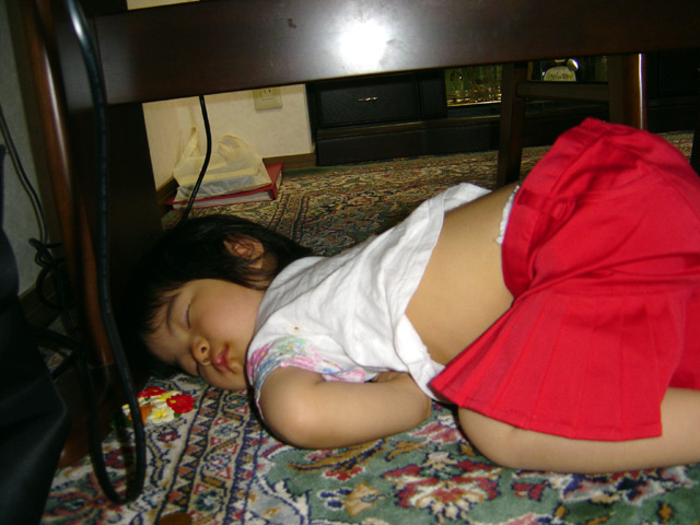 伊平のおじいちゃんとおばあちゃんがハワイで買ってきてくれたたくさんの洋服を ファッションショーのように着替えては喜んでいます。 この日は赤いスカートをはいている遊んでいるうちにテーブルの下で寝てしまいました。