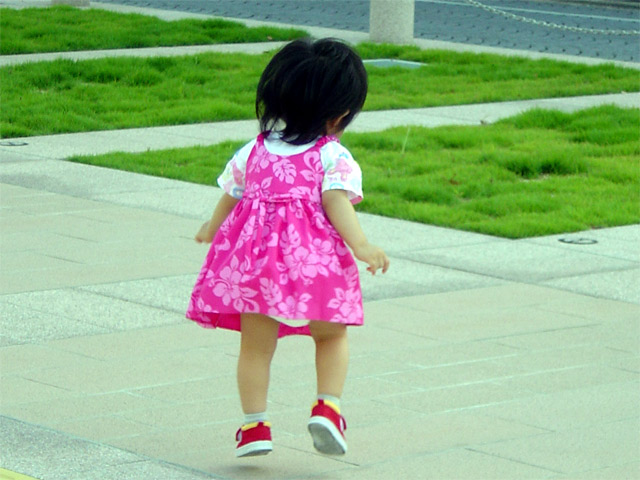 ハワイのお土産のかわいいワンピースを着ています。 ピョンピョンジャンプして走り回っています。