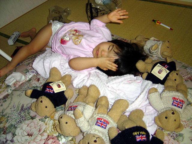6年前にパパとママがロンドンで購入し、大切にしまっておいた「テディベア」が 見つかってしまいました。 とうとう瑠衣のシモベになってしまいました。 周りにクマさんを侍らせてお休みです。