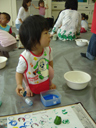 昨日の雨がすっかり上がって、秋晴れの一日。 「浜松こども館」の「親子でDo?〜スタンプ遊び〜」という図工教室へ出かけました。 今回は、絵の具をつけた野菜を使って画用紙にスタンプ遊びをする回でした。 瑠衣は、汚れても良いようにエプロンをつけて、レンコンを使って画用紙をスタンプし ました。 なかなか家ではできない遊びです。