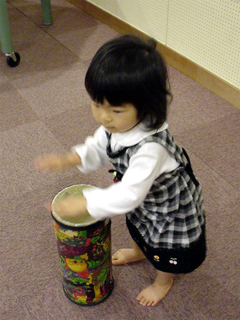 こども館へ遊びに行きました。本当はこの日は「親子でスィートポテトをつくろう」という 催しがあり、参加する予定でしたが、あいにく先着15組にもれてしまい、結局「うたとおどり」 のお遊戯教室に参加しました。 瑠衣は太鼓をたたいて大喜びしています。