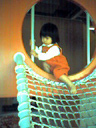 「浜松こども館」へ遊びに行きました。今まではアスレチックには興味を示すものの なかなかできないでいたのですが、今日は元気よく、ネットのはしごを駆け上がる事 ができました。 少し怖そうに下を見ている顔です。